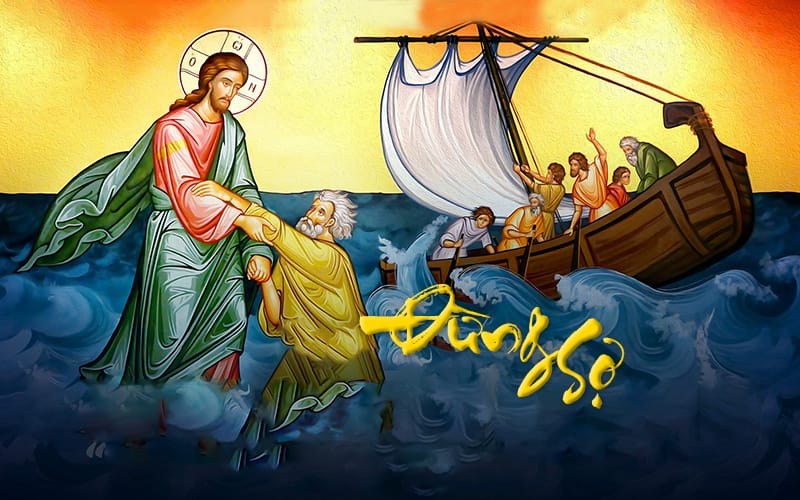 - Khi đi trên mặt nước để đến với Chúa Giêsu, Phêrô run sợ gần chìm, một lần nữa Thầy Giêsu động viên “ Cứ an tâm, Thầy đây đừng sợ” (Mt 14,27). Và trong biến cố Biến Hình Chúa Giêsu đụng vào các ông và nói “ Trỗi dậy đi, đừng sợ!” (Mt 17,7).