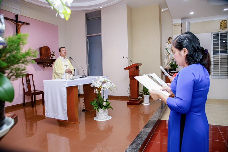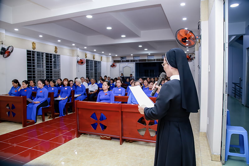 Được biết, hôm nay cũng là dịp mừng sinh nhật lần thứ IV của HHMTGKT nhóm An Nhơn. Để chuẩn bị tâm hồn cho ngày trọng đại này, tối hôm trước, các Anh Chị có giờ tĩnh tâm – Chầu Thánh Thể vào lúc 19g00 tại Nhà nguyện của cộng đoàn Mai Hương, do Cha Phó An Nhơn Anphongsô Lê Quốc Thắng hướng dẫn. Cha đã chia sẻ cùng các Hội viên về cuộc đời của Thánh nữ Têrêsa Avila và các phương thế giúp các Hội viên sống theo gương Thánh Bổn mạng.
