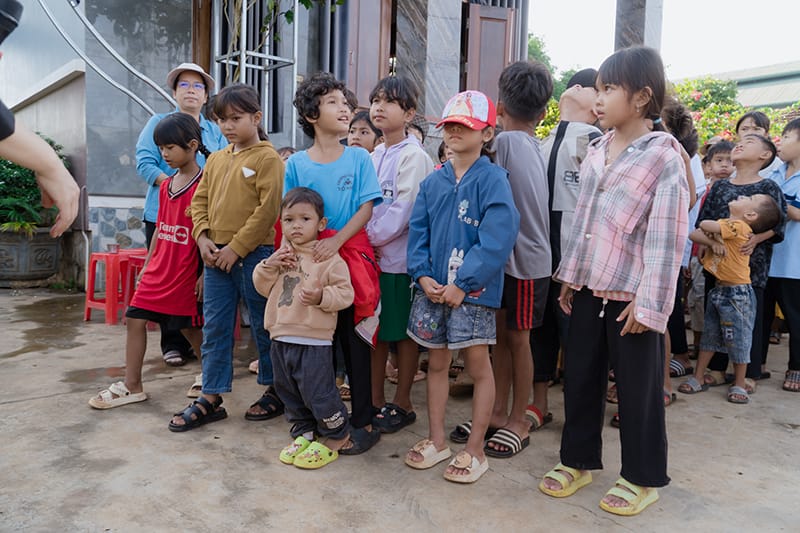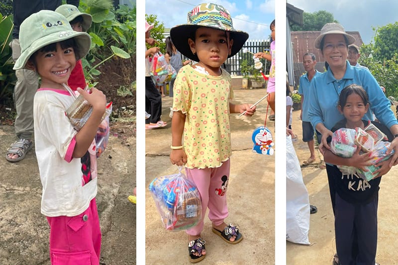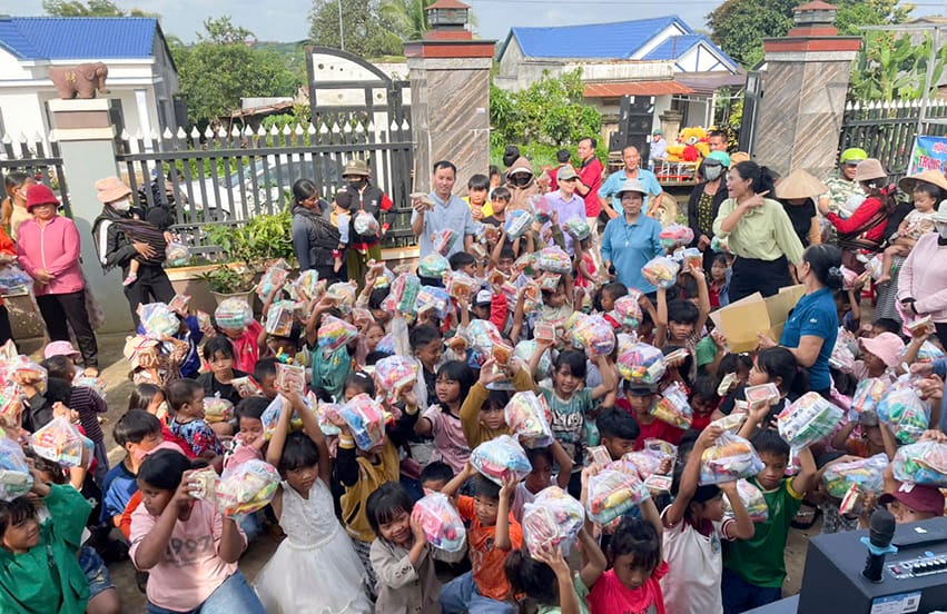 Chương trình mở đầu bằng những bài hát sinh động, tiếng trống lân tưng bừng của hội Trăng rằm. Trong không khí hân hoan ấy, đoàn đã trao tặng hơn 500 phần quà Trung Thu đến các em nhỏ, nhờ tấm lòng quảng đại của quý ân nhân xa gần. Mỗi phần quà chứa đựng cả tình yêu thương và sự quan tâm chân thành, gồm một chiếc bánh Trung Thu Givral thơm ngon, một chiếc lồng đèn xinh xắn, cùng phần quà bánh, kẹo và sữa …. Những ánh mắt trẻ thơ rạng rỡ, nụ cười hồn nhiên vang lên trong suốt buổi sáng từ 8h đến 10h, khiến không khí buôn làng ngập tràn niềm vui và hạnh phúc.