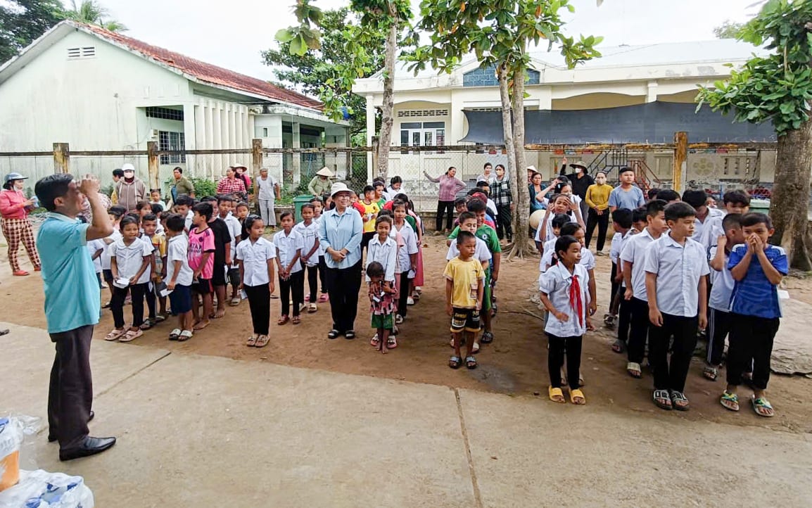 Ngày 27.9.2025, xe lăn bánh từ sáng sớm, vượt hơn 220 km, sau hơn 4 tiếng, 03 chị em chúng tôi có mặt tại trường Tiểu học Tập Ngãi A lúc 12g00, tham quan môi trường xung quanh, nơi đây đa số các em là người Khơ me, hoàn cảnh gia đình khó khăn. Các em có mặt trước giờ hẹn với sự háo hức và mong đợi nhận quà của tuổi thơ. Khi gặp chúng tôi, các em rất khép nép và lễ phép, dù không cùng tôn giáo, nhưng các em cũng biết “chào Sơ”. Đúng 13g30, dưới sự hướng dẫn của Thầy Tổng Phụ trách Nguyễn Hoàng Vinh, các em đã xếp hàng trật tự. Sau lời chào là bài múa “Tùng dinh dinh dinh cắc tùng dinh dinh dinh”. Mặc dù chưa quen với điệu múa nhưng các em vẫn cố gắng nhún nhảy theo các Sơ làm đội mẫu. Phụ huynh cổ võ bằng những cái vỗ tay thân thiện trìu mến. Cầm phiếu trên tay, các bé thật hạnh phúc lần lượt nhận quà, mỗi em được nhận một bánh Trung Thu, một chiếc lồng đèn, bánh kẹo, sữa…, có bé bàn tay nhỏ quá nên cầm không hết, quà rớt…. Những món quà nho nhỏ nhưng chứa đựng tình thương gửi đến các em, góp phần thắp sáng đêm Trung Thu của yêu thương mà Chúa đã ban tặng cho tuổi thơ.